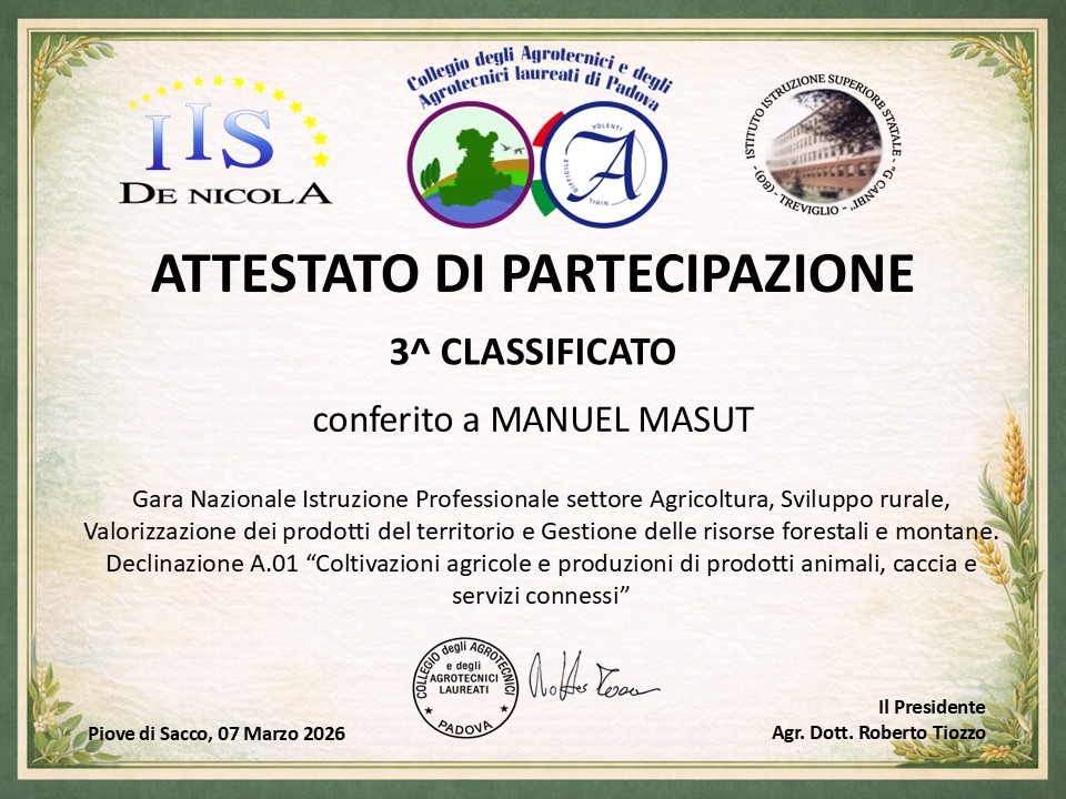 Presso l’IIS De Nicola si è svolta la premiazione del terzo classificato alle Gare Nazionali di Agraria. Il riconoscimento è stato conferito a Michele Masut, che si è distinto con il tema dedicato alla declinazione A01 – Coltivazioni agricole e produzione di prodotti animali, caccia e servizi connessi.